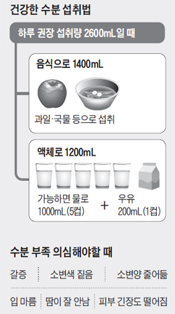 김선효 교수팀이 2008~2012년 국민건강영양조사 자료를 바탕으로 국내 성인의 수분 섭취량(물·음료 같은 액체 수분+음식 속 수분)을 산정해본 결과, 하루 평균 2414㎖(남 2465㎖, 여 2239㎖)의 수분을 섭취했다. 이는 수분 섭취 권장량(남성 2200~2600㎖, 여성 1900~2100㎖)에 맞게 마시고 있는 것이다. 김선효 교수는 "수분 섭취 실태를 자세히 보면 개인 편차가 크다"며 "많은 사람들이 순수한 물이 아닌 음료수·커피·술로 수분 보충을 하고 있는 것도 문제"라고 말했다.